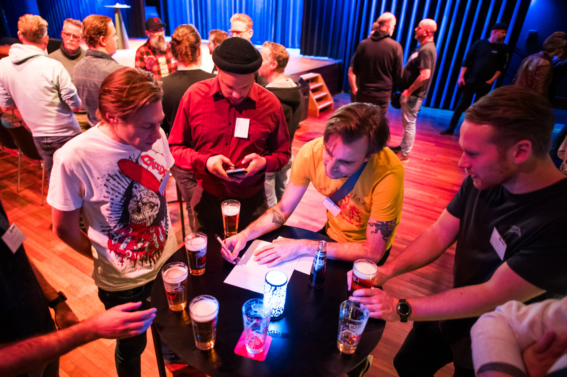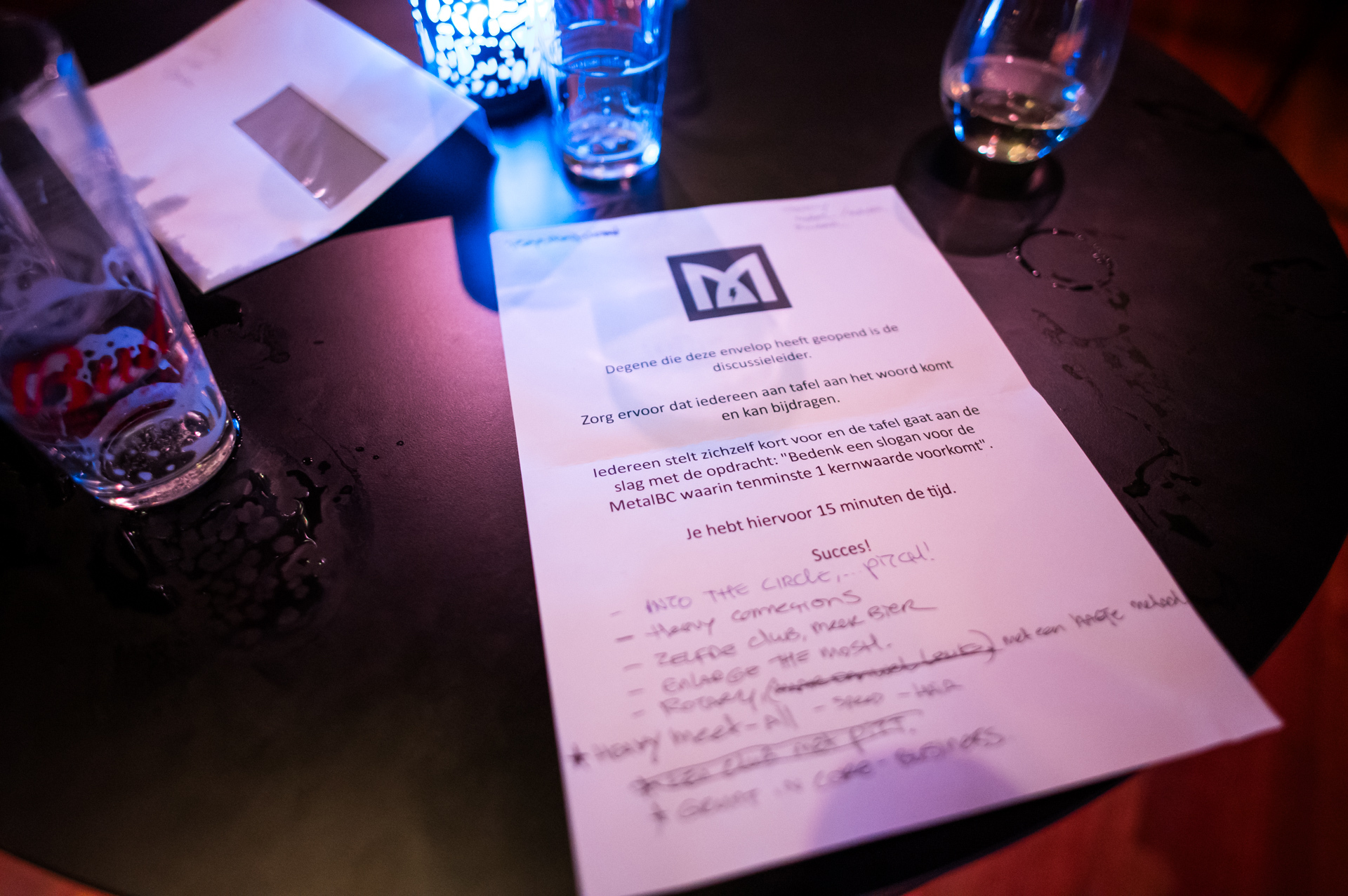 Nach einer kurzen Einführung durch Tom Schilders wurde der offizielle Teil sofort aktionsorientiert, da wir in 10 Gruppen von durchschnittlich 9 Personen um die Stehtische herum arbeiten mussten. Jeder bekam die Gelegenheit, sich kurz dem Rest der Gruppe vorzustellen, und dann war es an der Zeit, zusammenzuarbeiten, denn die Aufgabe lautete: Erfinde einen Slogan für das MetalBC, der mindestens einen Grundwert enthält. Die Ergebnisse waren sehr überraschend und scharfsinnig!
